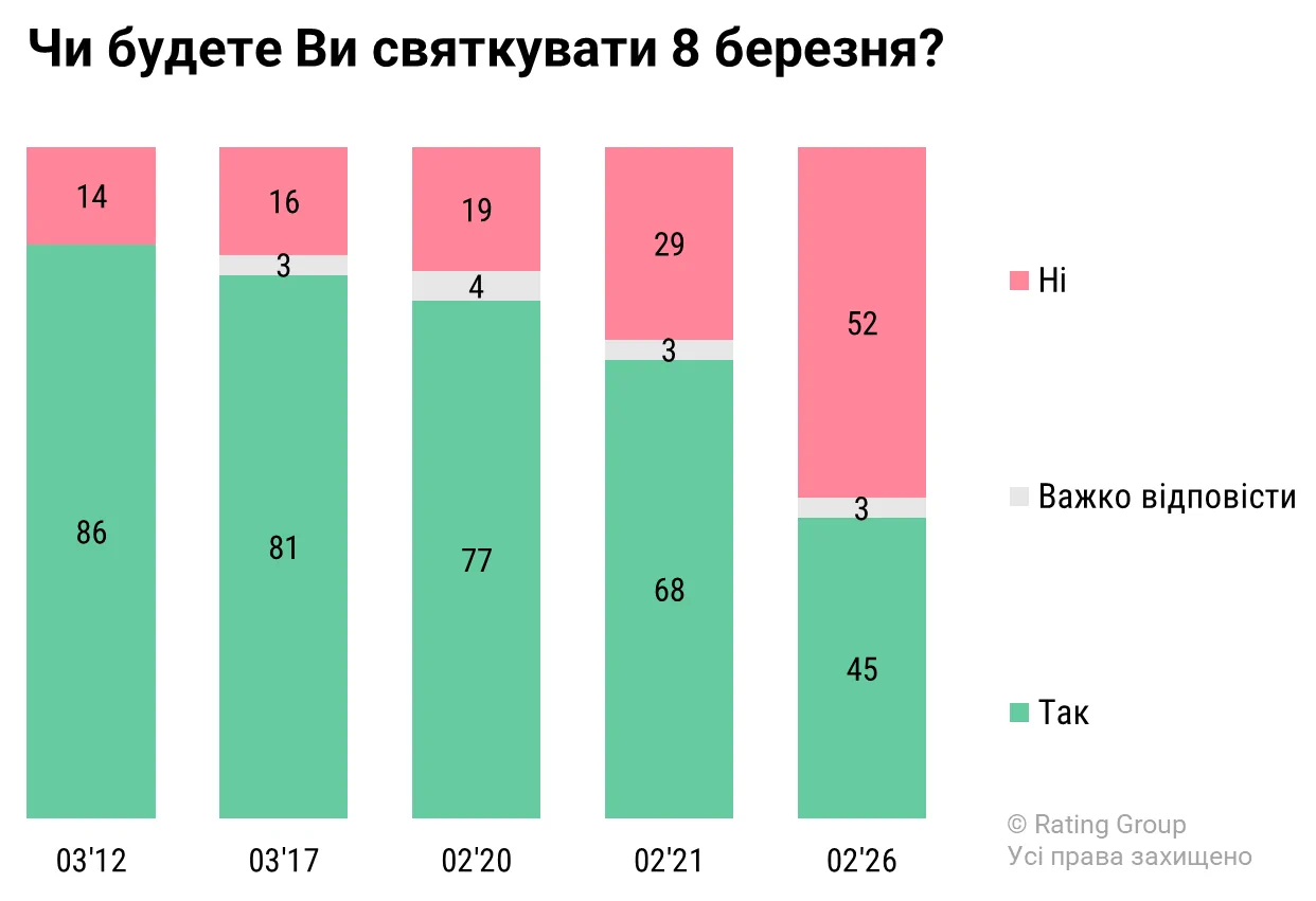 Для порівняння: п'ять років тому (у лютому 2021) 8 березня відзначала абсолютна більшість - 68%.