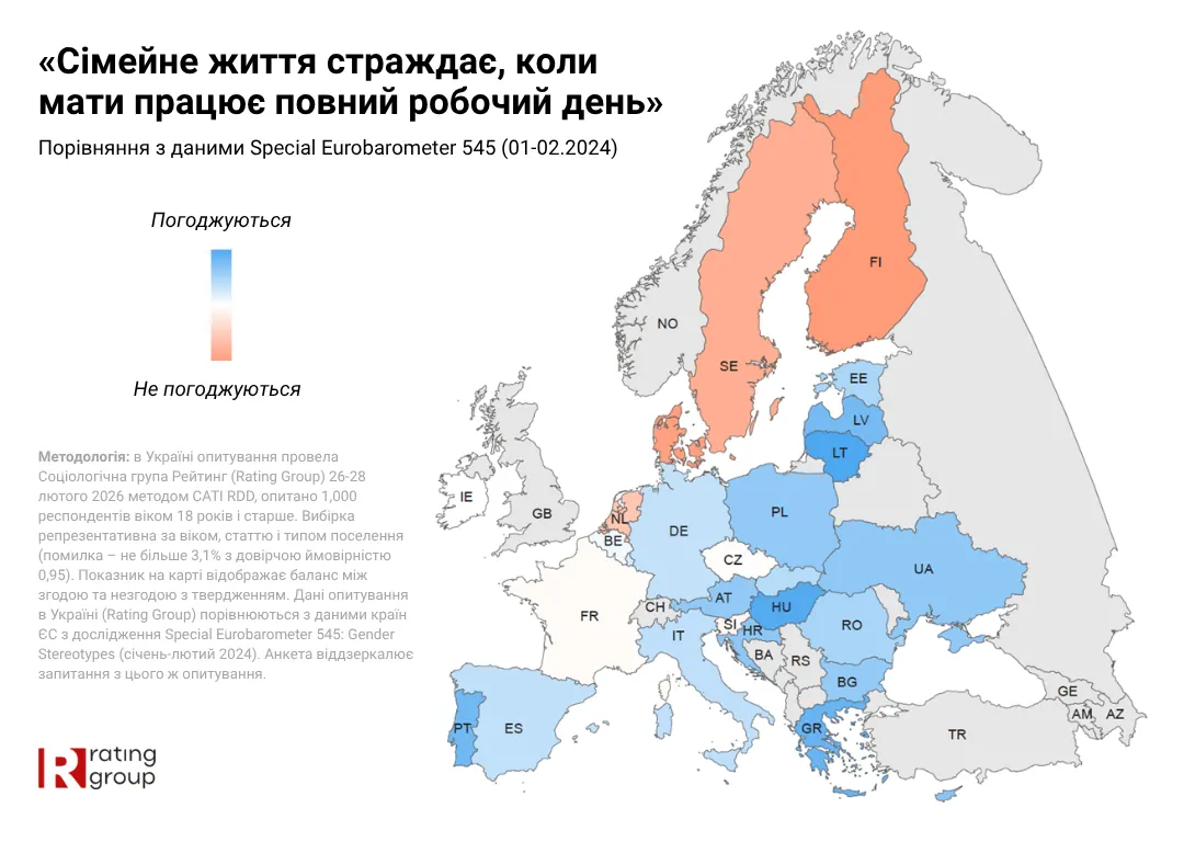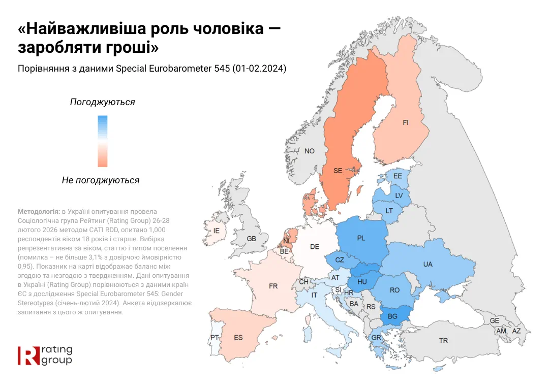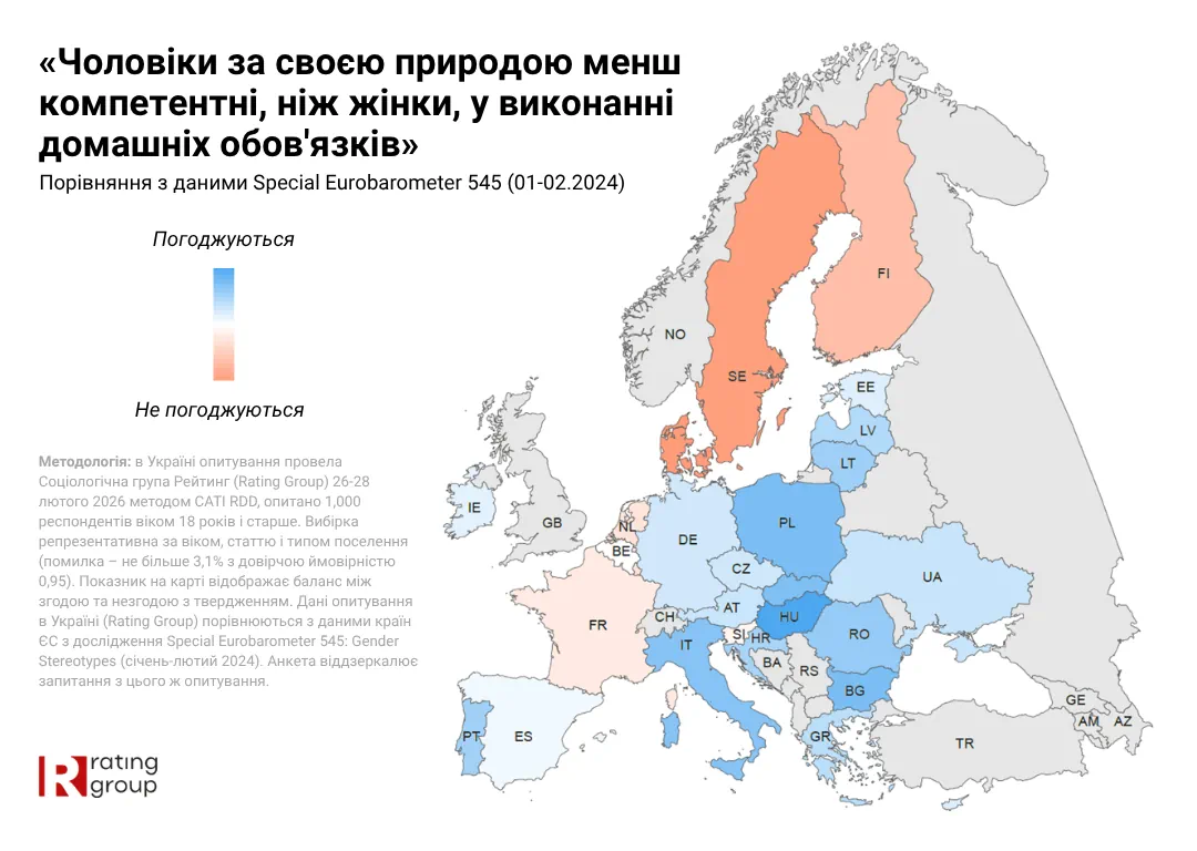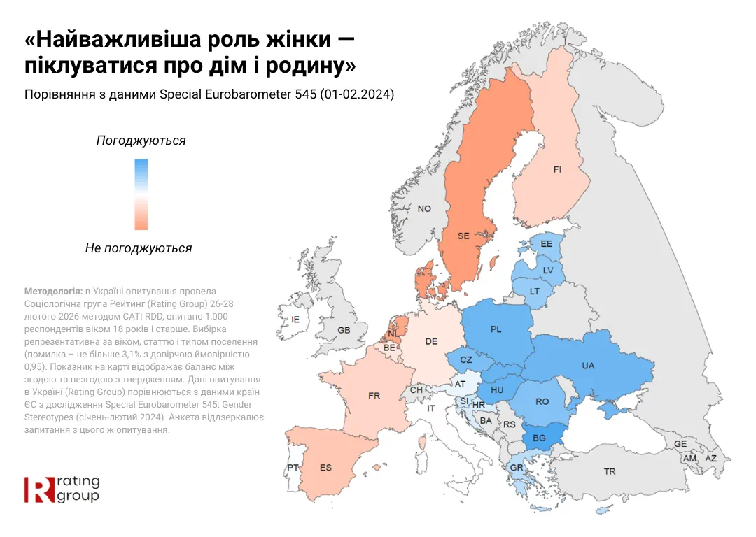 Дані опитування в Україні (Rating Group) порівнюються з даними країн ЄС з дослідження Eurobarometer (Special Eurobarometer 545. Gender Stereotypes, січень-лютий 2024). Анкета віддзеркалює запитання з цього ж опитування.