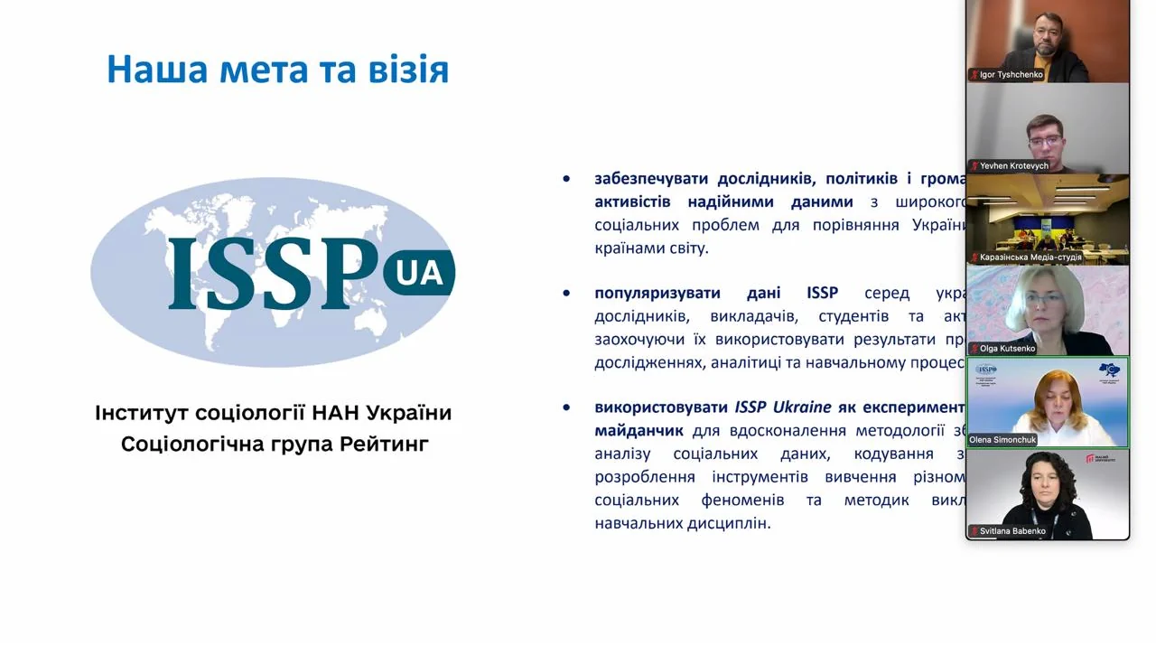 21 листопада Rating Group й Інститут соціології НАН України презентували перші результати міжнародного опитування International Social Survey Programme (ISSP) 2025 в Україні. Дослідження представляли Олена Симончук (докторка соціологічних наук, завідувачка відділу соціальних структур Iнституту соціології НАН України), Ігор Тищенко (засновник і CEO Rating Group) і Євген Кротевич, керівник відділу аналітики Rating Group (департамент експериментальних досліджень).